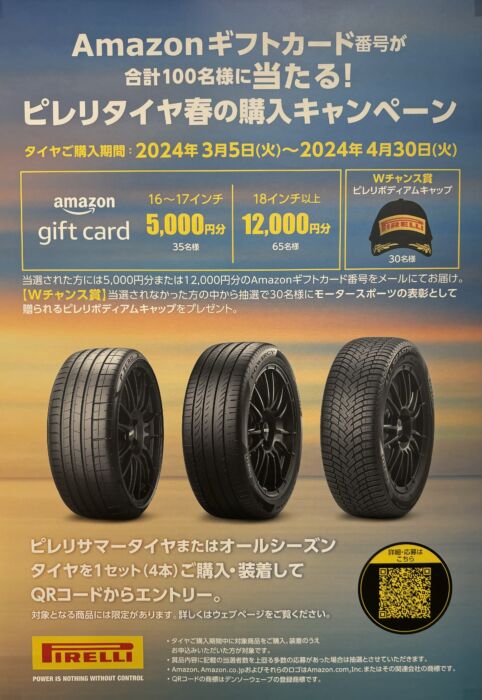 ピレリサマータイヤまたはオールシーズンタイヤを1セット(4本)購入、装着して応募すると、抽選で購入インチに応じた金額のAmazonギフトカード番号を合計100名様にメールでプレゼント