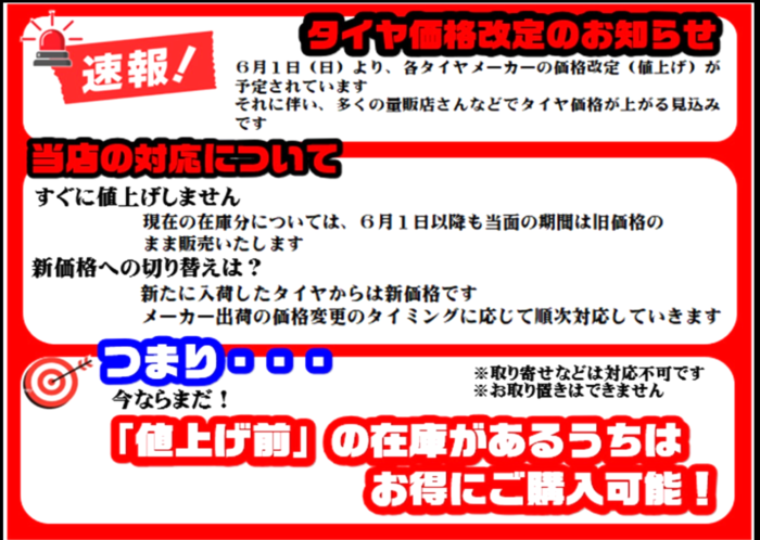 長久手 速報!5月仕入値上げ前のタイヤ!タイヤ激安!!タイヤ買う前に是非ご相談ください!タイヤ激安!! 長久手 日進 名東区 みよし市 名古屋 東郷 豊田 【タイヤを安く買うならホットロード】