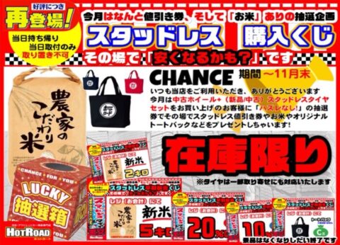 #車 #タイヤ #ホイール #タイヤ交換 #カー用品 #工具 #通勤車 #カスタムカー #カーアクセサリー #中古パーツ #中古タイヤ #中古ホイール #DIY #煽り運転 #ドライブ #ドライブデート #車好き女子 #車好き男子 #車好きな人と繋がりたい #新米 #お米 #くじ引き #特賞 #クーポン #トートバッグ #スタッドレス #スタッドレスセット #期間延長