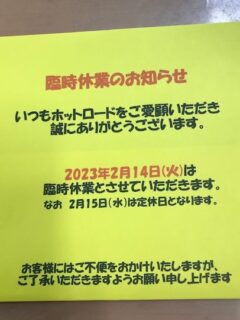 HOME > ブログ > 全店共通 > お知らせ > ホットロード全店 2月14日(火) 臨時休業のお知らせ